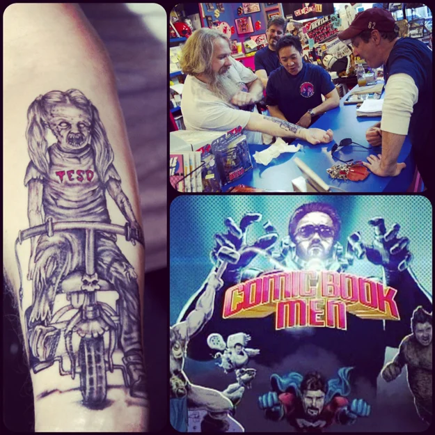 We are so honored and excited to be even a small part of our favorite show on television, Comic Book Men. Mike designed the rad tattoo for Bryan Johnson of his adorable niece, Sage. And the tattoo looks so freakin' awesome! Kudos to the tattoo artist for doing a fantastic job. Such a wonderful moment when Bryan and Sage were together talking about it at the end of the episode. Both my brother and I had watery eyes.